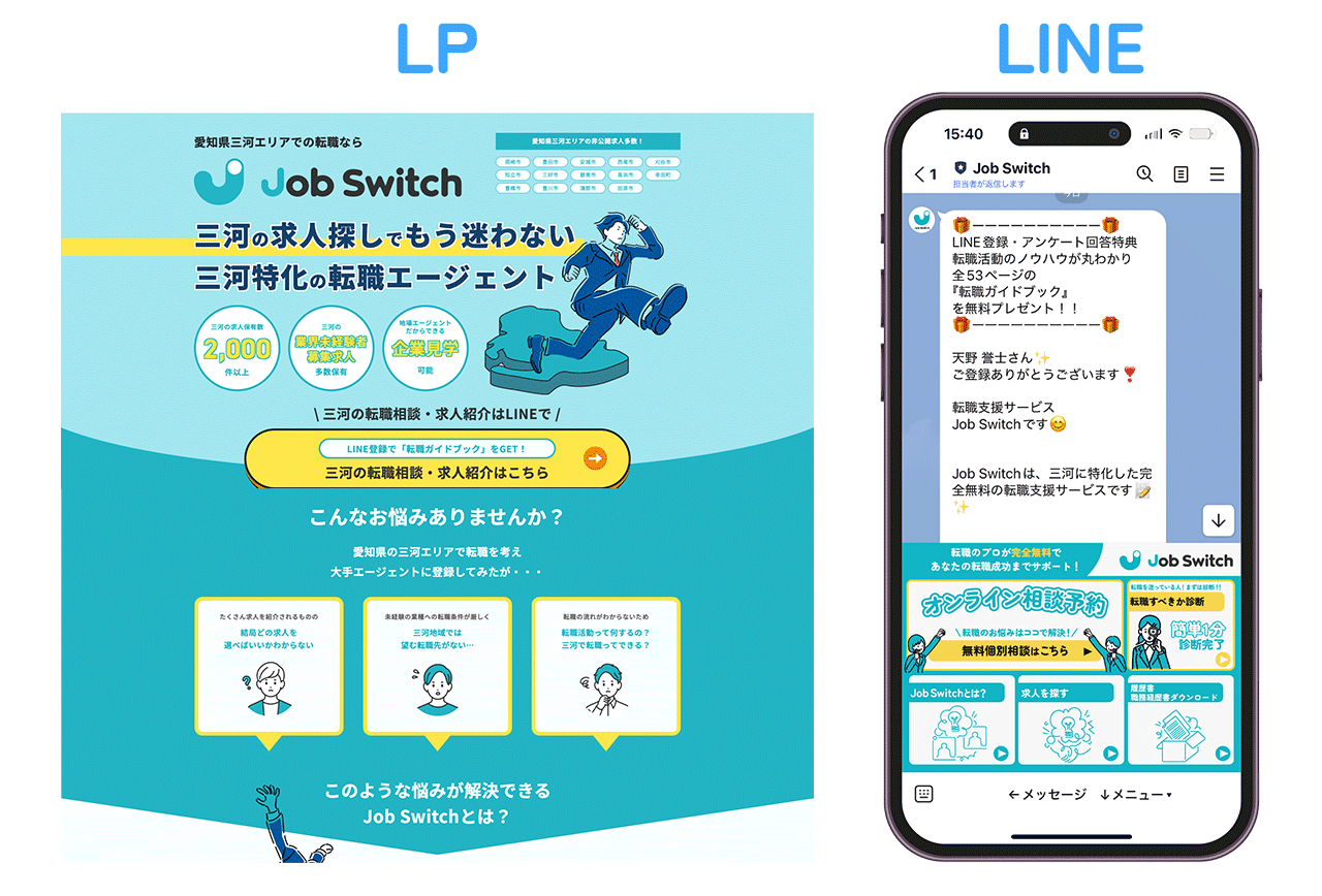 愛知県三河エリアでの転職を希望する求職者をどう集めるかが課題であったエンルーツ様。Web広告を使い、まずはLPで転職支援サービス(Job Switch)を三河エリアで転職を考えている人に知ってもらい、興味を持った人がJob SwitchのLINE公式アカウントへ登録してもらう流れを構築。
