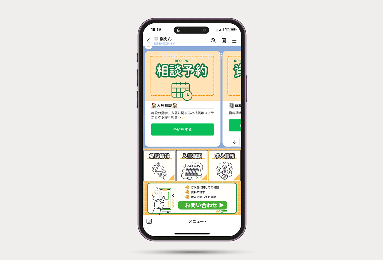 入居者様のご家族とのやりとり(書面の送付や電話対応等)に手間がかかっているとご相談をいただき、入居者ご家族との連絡の円滑化・入居希望者様の相談予約の自動化・求人募集の導線作成などの仕組みを構築させていただきました。