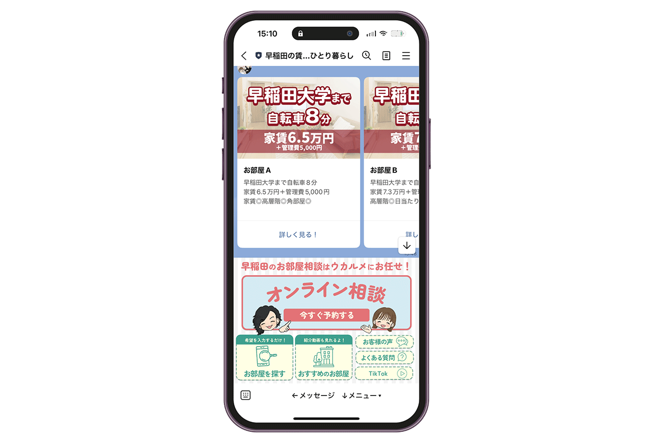 画像や動画を使い視覚的にわかりやすい配信を行うことで、LINE登録者へ「ウカルメひとり暮らしを活用するメリット」や「オンライン内見の便利さ」などを伝わりやすくしました。また、配信を見た人がそのままオンライン相談へ迷わずに予約できるように、配信にオンライン予約のリンクを付与し、自然な流れでオンライン相談へ行き着く流れを構築。